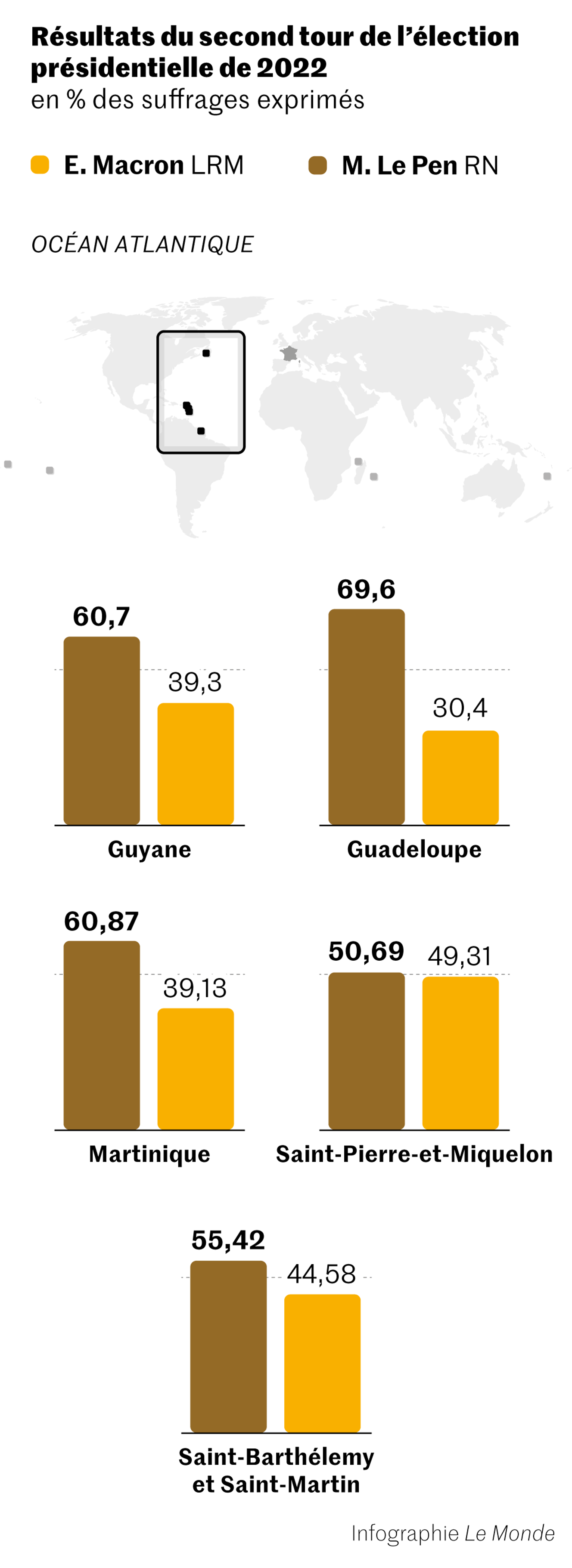 The National Rally (RN) candidate won with 69.6% of the vote Guadeloupe And 60.8% MartiniqueAt 60.7% GuyanaUp to 54.7% St. BartholomewAs well as St. Pierre and Michelon (50.6%), according to figures released by the Interior Ministry. Between 2022 and 2017, Marine Le Pen scored over forty-seven points in Martinique, thirty-six points in Guadeloupe and over twenty-five points in Guyana.